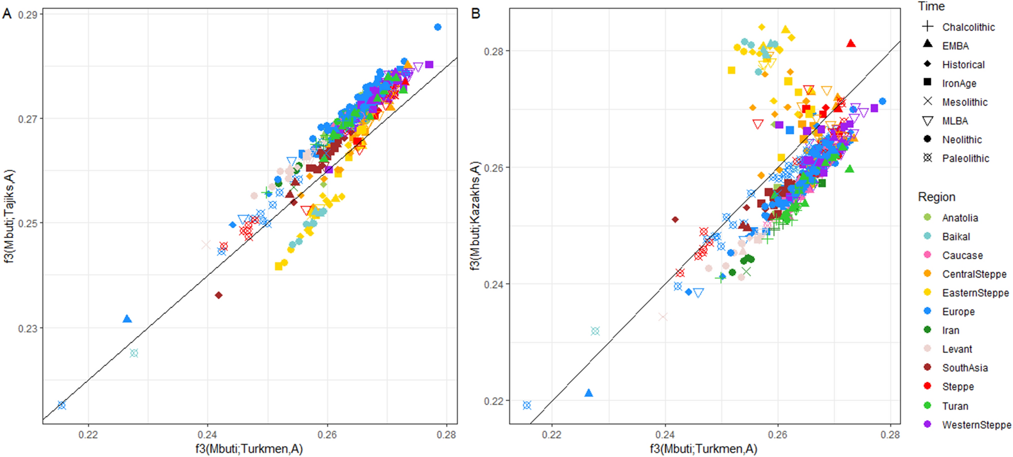 外群f3統計(ムブティ人;古代の人口集団、現在の人口集団)に基づいて、最初のデータセットのトルクメン人を含むすべてのアジア中央部人口集団について、古代の人口集団との遺伝的類似性の特性が確立されました(図5)。あらゆる古代の人口集団とトルクメン人を比較する外群f3統計値は、あらゆる古代の人口集団とタジク人を比較するそれと相関します(図5A)。一方、東部草原地帯集団およびバイカル湖集団をテュルク語族およびモンゴル語族人口集団(カザフ人)と比較する外群f3統計値は、古代の人口集団とトルクメン人を比較する場合よりも高くなります(図5B)。トルクメン人は、共有されているシベリア/アジア東部祖先系統の量について、テュルク語族およびモンゴル語族人口集団よりもインド・イラン語派人口集団の方と類似しています。以下は本論文の図5です。
