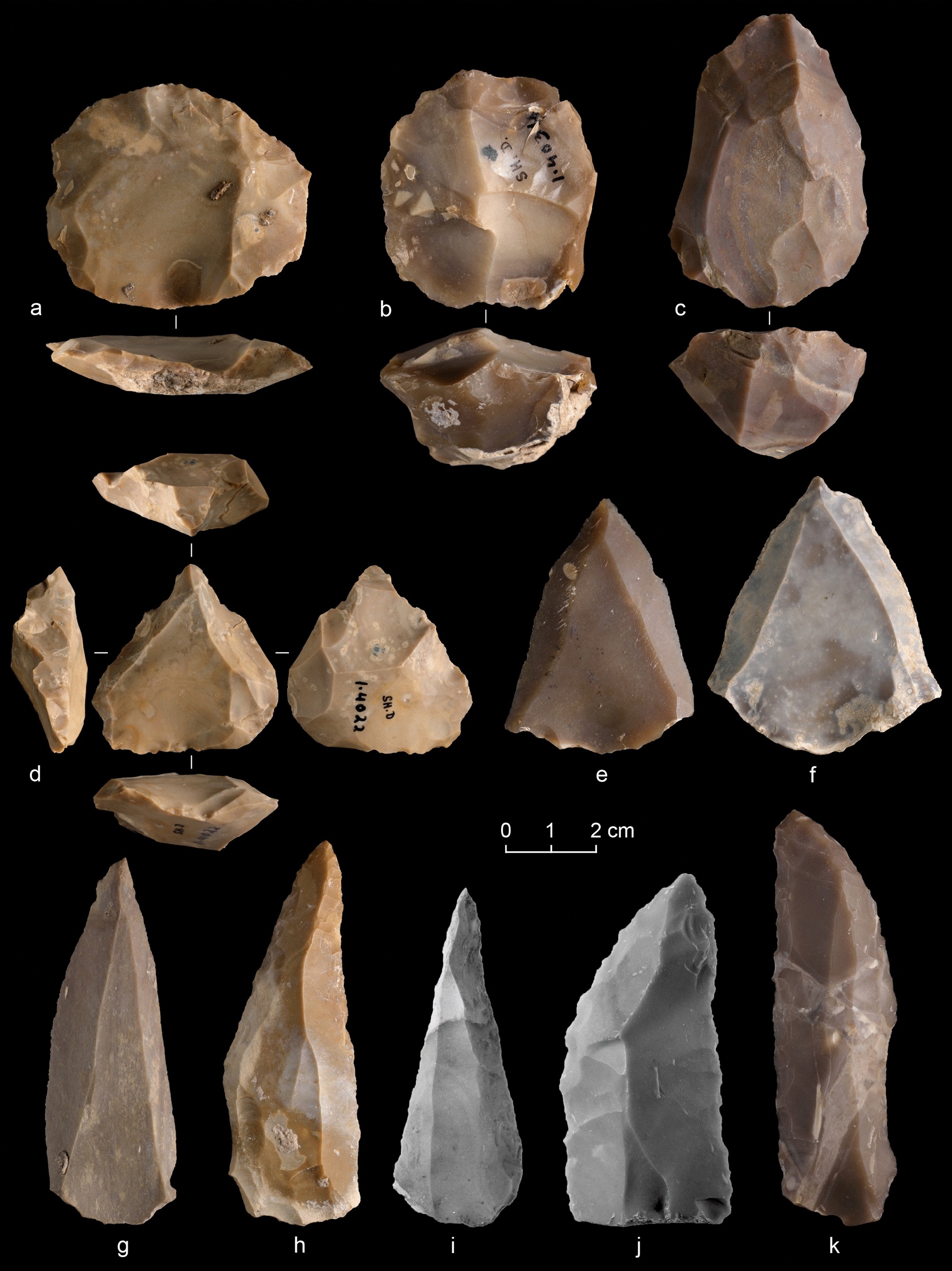 ロックフェラー博物館に収蔵されている中部旧石器時代石器群は、おもに求心状ルヴァロワ技法が優占的です(図2a・b)。双方向および単方向収束技法はあまり目立ちません(図2c・e・f・g)。使い尽くされた石核は、形態と短くて急な端部隆起(42度)の観点でヌビア式石核と表面的に似ています(図2d)。詳細な技術分析がなければ、この石核が真のヌビア式縮小体系に由来するのか、それとも大きく縮小された求心状石核なのか、不明です。節約的説明は後者を示唆します。とくに、収集物には、収束状掻器や集中的に再加工された石刃や2点のフンマル(Hummal)式尖頭器など、大型石刃で作られたいくつかの道具があります(図2h・i・j・k)。これらは、初期中部旧石器時のいわゆる「タブンD型(Tabun-D)」伝統の典型です。さらに、求心状ルヴァロワ技法の優占は海洋酸素同位体ステージ(MIS)5石器群の特徴です。