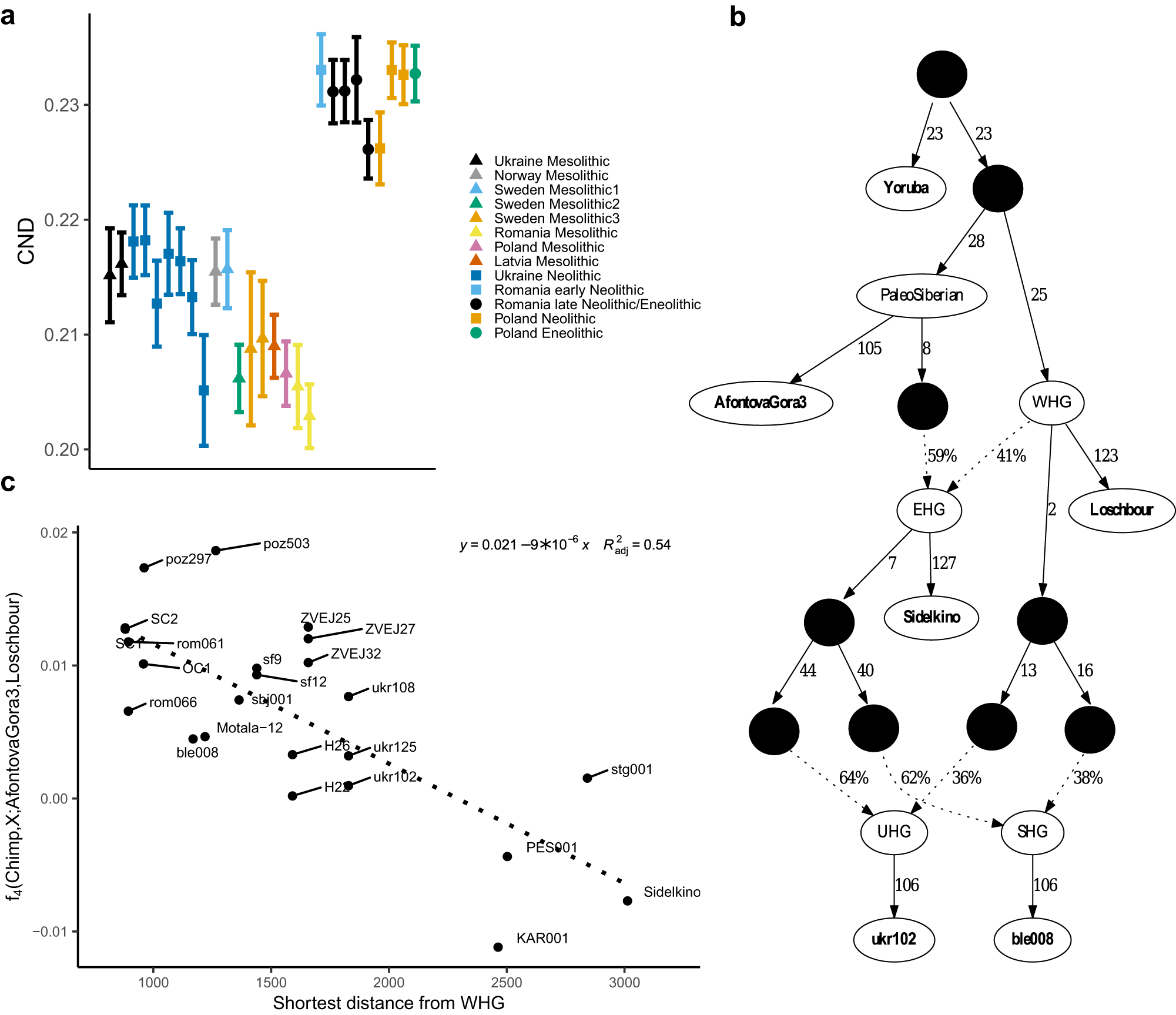 検定の能力を高めるため、1000人ゲノム重複パネルから、ロシア西部のサマラ(Samara)のシデルキノ(Sidelkino)遺跡個体も使用して、f₄統計(チンパンジー、シデルキノ;X、ロシュブール)が計算され、東方系統からすべての調べられたヨーロッパ中央部および東部および北部の中石器時代個体群への有意な寄与が確証されました。後者の事例では、中石器時代のシデルキノ個体はEHGを、ロシュブール個体はWHGを表します。モデルに基づく2方向分析は、19の事例で混合モデル(WHGとAG3)を単一供給源モデルから分離し、15の事例で両単一供給源モデルが却下されました。WHG関連祖先系統の推定混合割合は、シデルキノ個体では50.9%(ジャックナイフ信頼区間では40.9~60.9%)、ルーマニアのスケラ・クラドヴェイ(Schela Cladovei、略してSC)の個体(SC1)では88%(ジャックナイフ信頼区間では76.2~99.8%)の範囲です。