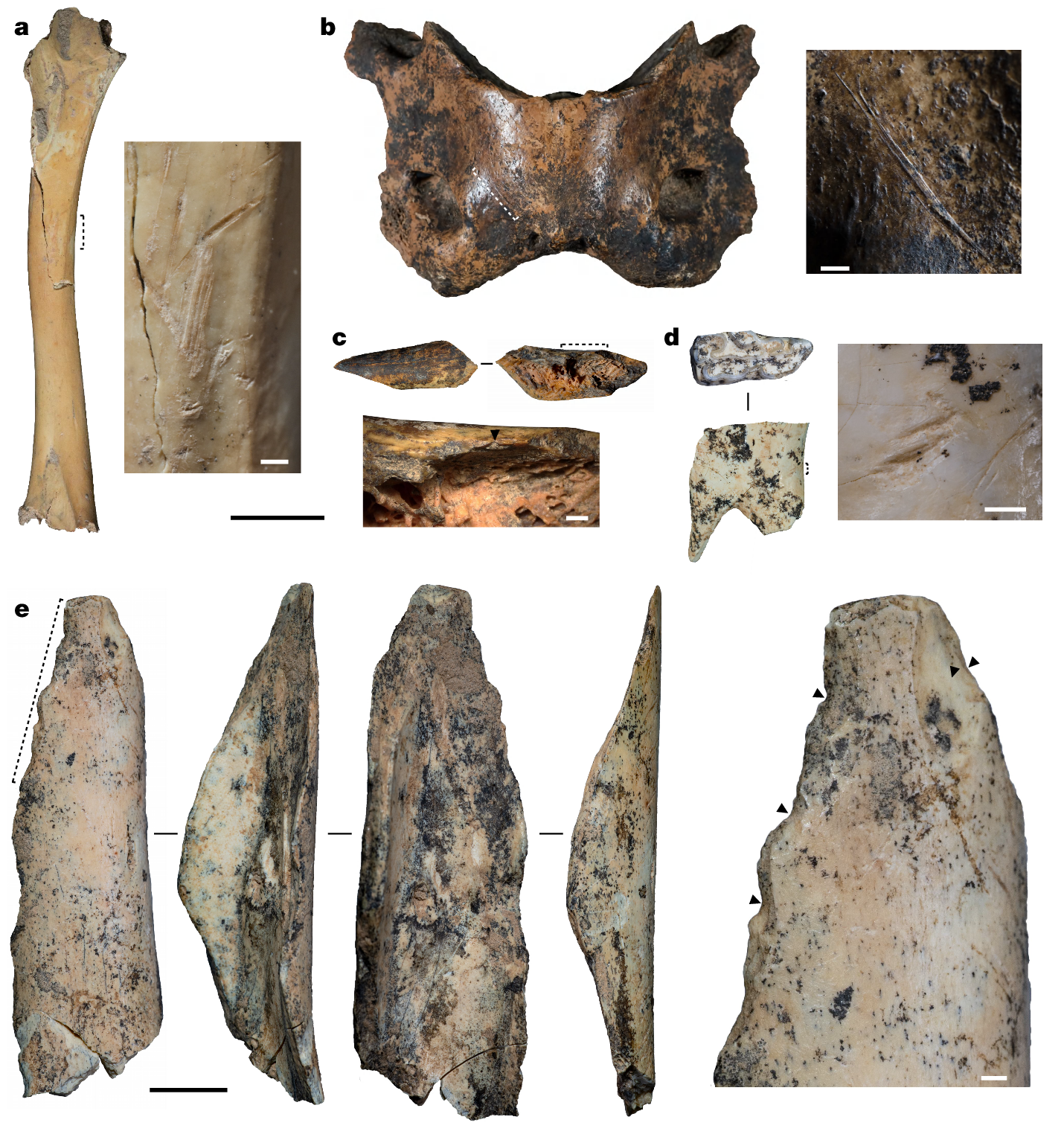 人為的変化は、肉食動物や小型哺乳類や鳥類の骨にも存在します(図2)。肉食動物標本(102点)のうち、解体痕と打撃による刻み目がブチハイエナ属種やヒョウ亜科(Pantherinae)やイヌ科(Canidae)の数点の標本に存在しますが、イヌ科標本については、アカギツネ(Vulpes vulpes)やチベットスナギツネ(Vulpes ferrilata)には存在しません。小型哺乳類のうち、打撃による刻み目がマーモット属種(Marmota sp.)の橈骨幹1点(第9層)で観察され(図2c)、骨髄抽出が示唆されます。さらに、第3・4・11層の7点のノウサギ属種(Lepus sp.)と第9~11層の4点のマーモット属種の前肢と後肢の骨幹断片は、通常ではヒトの活動の痕跡として扱われる、新鮮骨(腸骨や上下顎骨や歯槽骨)の破損を示しています。最後に、鳥類遺骸(45点)のうち、解体痕(1点、図2a)と新鮮骨の破損(3点)がワシの標本に存在しますが、キジ科かウズラかフクロウの1点の標本を含めて、他の鳥類種の標本には存在しません。動物考古学のデータからは全体的に、BKCの人類は広範な種を利用しており、それには大型草食動物や、それより少ないものの小型哺乳類や鳥類が含まれている、と示唆されます。以下は本論文の図2です。