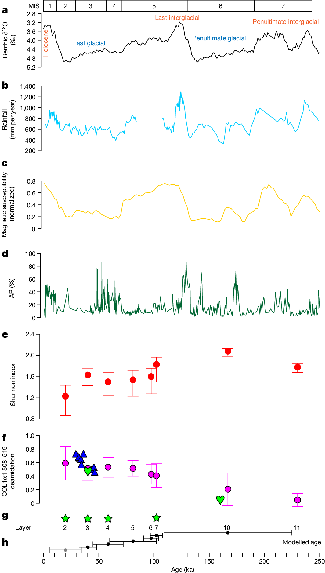 BKCの第10層と第11層は、BKCで最も豊富な考古学的遺物を提供し、それには本論文で分析された骨標本の60%以上が含まれますが、残念ながら、これまでその居住者の生物学的属性を確証する人類遺骸もしくは堆積物のmtDNAはありませんでした。しかし、夏河1号で得られた2点のアミド分解値はそれぞれ、第10層と第11層の骨標本で観察されたアミド分解値の範囲内にのみ収まります(図4f)。さらに、夏河1号のウラン系列年代の下限年代は16万年前頃で(Chen et al., 2019)、これは第10層もしくはそれより下の層の年代に相当します(図4g)。これは、夏河1号がBKCの第10層か第11層かそれより下の層に確実に由来する、と示しているわけではありませんが、夏河デニソワ人がこれらの層の形成中の居住者だった可能性が最も高いことを示しています。以下は本論文の図4です。