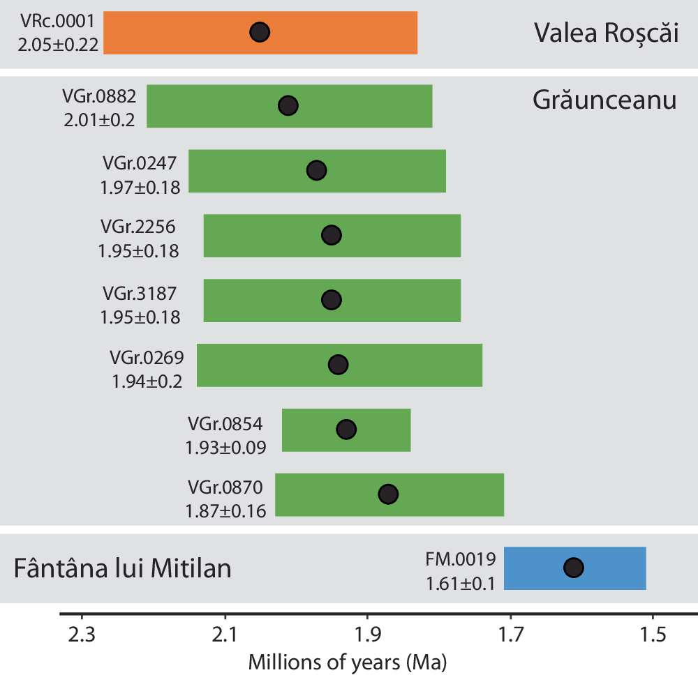 これらのU-Pb推定値はグラウンセアヌ遺跡とファンタナ・ルイ・ミティラン遺跡の生物年代学的推定値、グラウンセアヌ遺跡と同様の年代と示唆されてきたおよびヴァレア・ロスカイ遺跡の層序学的位置づけと一致します。これらの結果は化石堆積の下限年代の最良な推定値を提供し、それは、これらの結果が、化石の歯と骨の標本に遍在している、環境との堆積後のウラン交換のU-Pb系の最終的な閉鎖を表しているからです。堆積と閉鎖との間の時期はほぼ確実に変動し、おそらくは場所によります。これらのU-Pbの結果は、これらの遺跡の生物年代学と組み合わされて、195万年以上前および200万年以上前にさかのぼる可能性という、グラウンセアヌ遺跡の堆積の本論文の推定年代に高い信頼度を与え、グラウンセアヌ遺跡が人類の活動の証拠を示すヨーロッパでは最古級の遺跡であるかもしれない、と示唆しています。