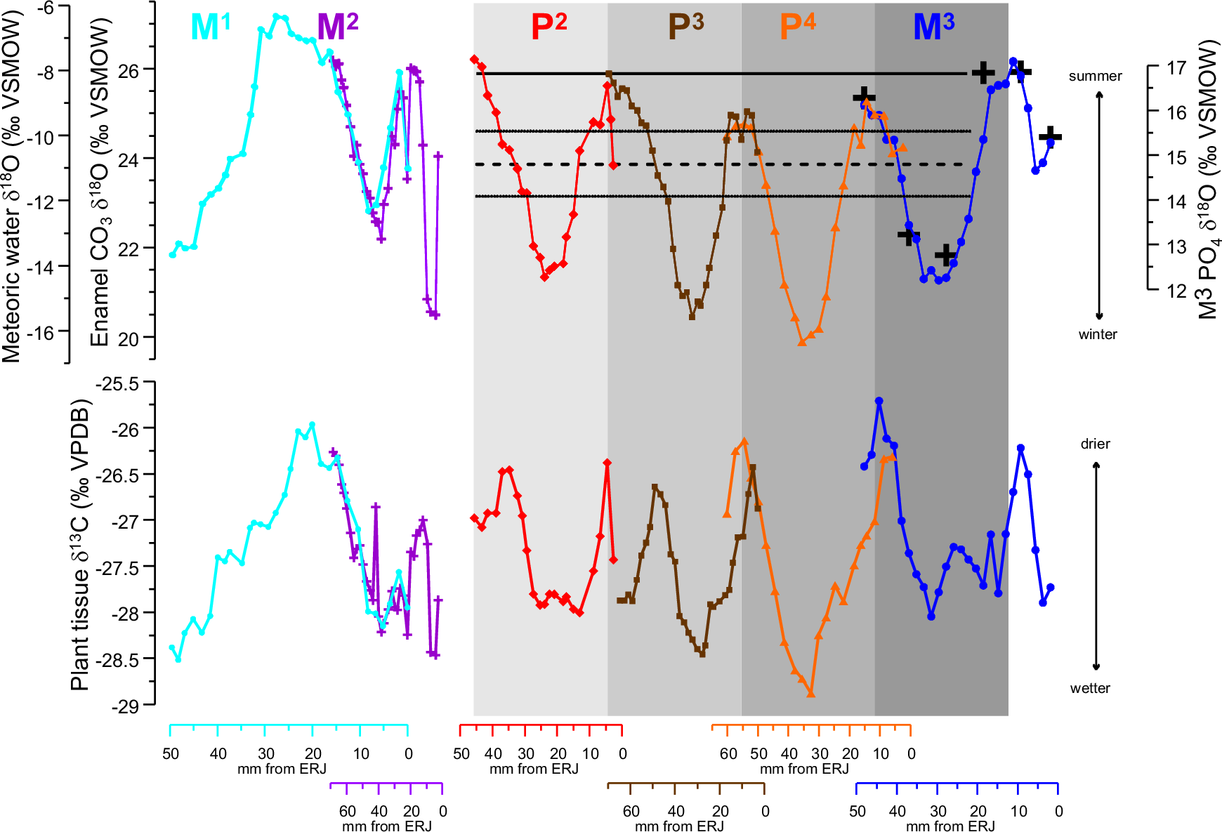 グラウンセアヌ遺跡のウマ属種標本の離乳後の頬歯から得られた、酸素(δ¹⁸O)と炭素(δ¹³C)の安定同位体比が分析されました(図4)。高解像度標本抽出を用いて、歯冠および歯列(P2-M3)全体の差異が評価されたことによって、降水量の季節的変動の調査が可能となり、それは、ウマ科が必ず水を飲む動物で(つまり、単数供給源に依存)、その食性が比較的固定されているからです(つまり、体重900kg以上となる、おもに草本を採食する動物)。以下は本論文の図4です。