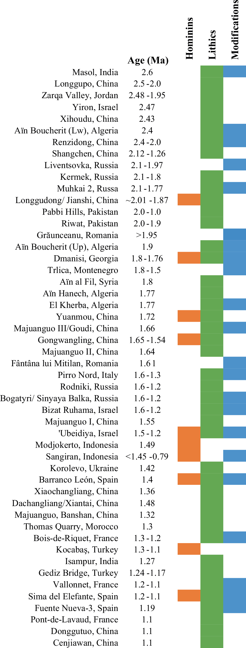 200万~150万年前頃の別の数十ヶ所の遺跡は、ふたたび中東とロシアと中国にまとまっており、アフリカ外の人類の最初の確実な証拠が含まれ、つまりはドマニシ遺跡と中国の公王嶺(Gongwangling)遺跡です。150万~100万年前頃には、ヨーロッパと遠くアジア南東部における人類の存在を示唆する最初の遺跡があり、注目すべきことにこれらの遺跡は、人類化石、充分に定義された石器群、屠殺の証拠を示す動物の骨があるずっと多くの遺跡の形で、人類の確実な証拠を示しています。現時点では、ヨーロッパの最古級の人類化石は、140万年前頃となるスペイン南部のアンダルシア州グラナダ県にあるオース(Orce)地域のバランコレオン(Barranco León)遺跡[35]、130万~110万年前頃となるトルコのコカバス(Kocabaş)遺跡、120万~110万年前頃となるスペインのシマ・デル・エレファンテ(Sima del Elefante)遺跡[37]ですが、複数の他の遺跡には石器群と切創痕のある動物相遺骸があります(図5)。