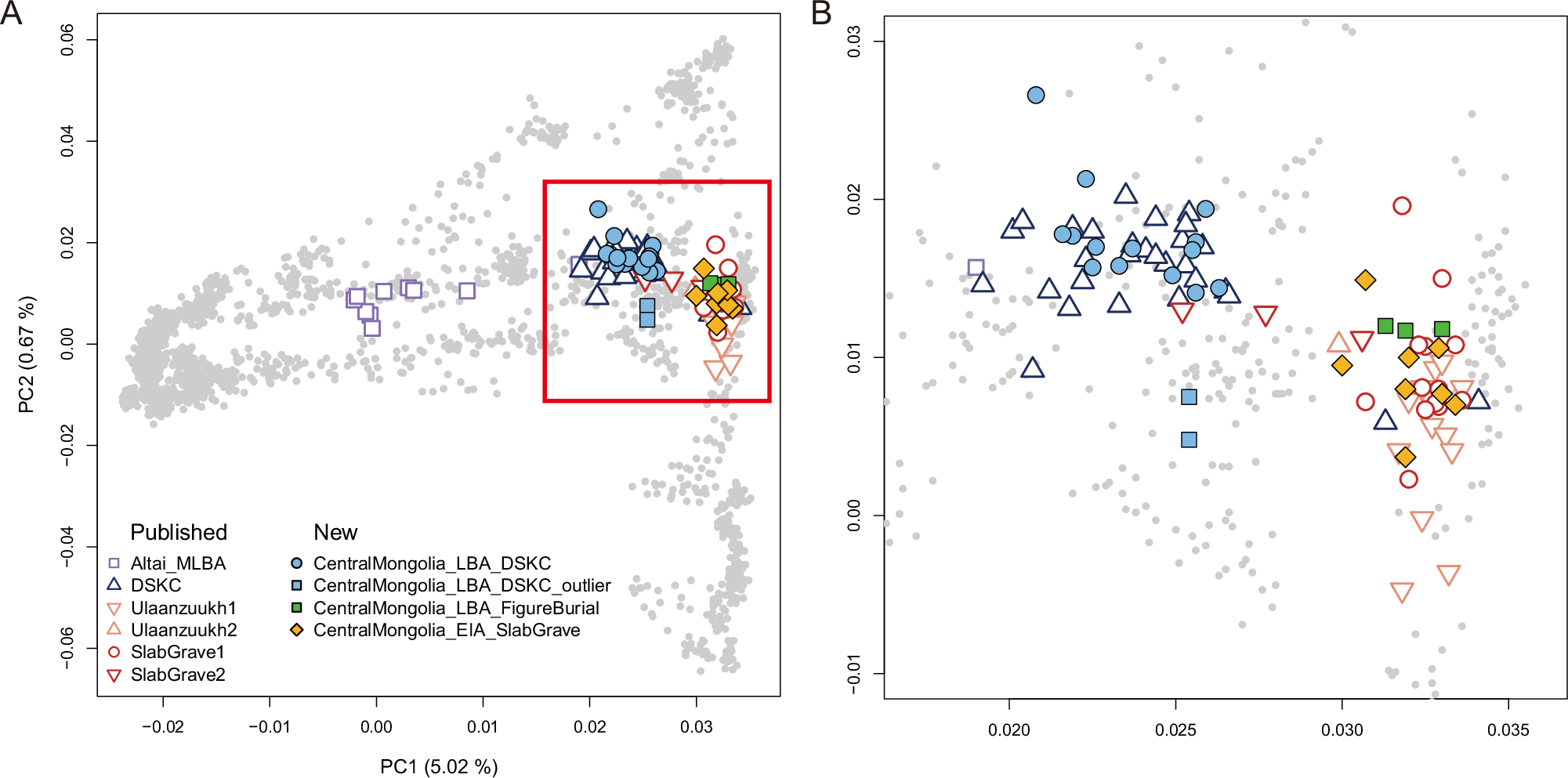 新たに遺伝子型決定された30個体のうち16個体は、LBAのこの地域における優勢な考古学的伝統だったDSKC文化と関連する古墳から発掘されました。これらのうち1個体(KHG006)は、それ以前のMBAのムンクハイルハン墓に特徴的な特色も示す古墳で見つかり、その年代はLBAのDSKC墓の典型より古い紀元前1500年頃以前でする現時点で、MBAのムンクハイルハンについて充分な考古学的および遺伝学的情報は、研究に利用可能な遺骸の少なさのため不足しているので、この個体はLBAのDSKC文化内に含められました。LBAの3個体はモンゴル東部および南部に典型的な特徴を示す埋葬から発掘され、1個体は石像形墓(MKT004)から、2個体は入れ子構造の墓(MKT013とMKT014)から見つかりました。入れ子構造の墓はこれまでモンゴル東部および南部MKT遺跡でのみ報告されてきましたが、その考古学的特徴石像形墓と密接に一致するので、MKT個体群はLBAの石像形埋葬伝統の一部に分類されました。これらの調査結果から、MKTは、DSKCおよび石像形両方の埋葬伝統を含む、新たに分析されたLBA/EIAの4ヶ所の遺跡のうち唯一の遺跡と確証されます。他の8個体は、EIAの石板墓文化と関連す目石板墓から発掘されました。最後に、匈奴期(KHG005)とウイグル期(SOV001)とモンゴル期(AMY001)の埋葬から1個体ずつ発掘されました(図1)。