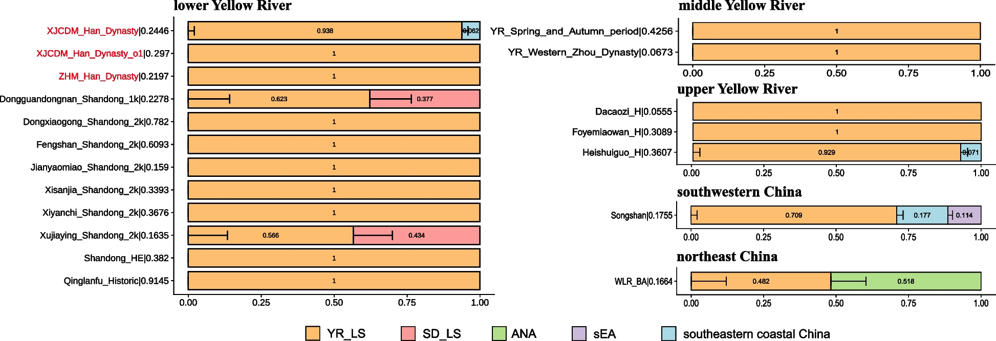 龍山文化期の後の黄河中流域(考古学的には青銅器時代の相当する、黄河の春秋時代および西周王朝)では、f₄統計は黄河_LNと比較して有意な負の偏差(Z得点が3未満)を明らかにはしませんでした(図2D)。qpAdmモデル化では、これらの人口集団は黄河_龍山関連祖先系統に完全に由来すると表すことができる、とさらに確証されました。